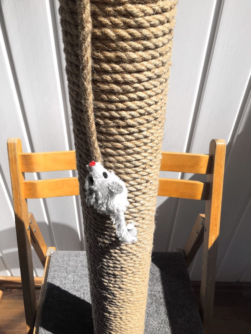 - Tie or glue down the furry toy to the end of the loose rope section. To attach more securely, you may want to cut a small hole in the toy and glue the rope inside.